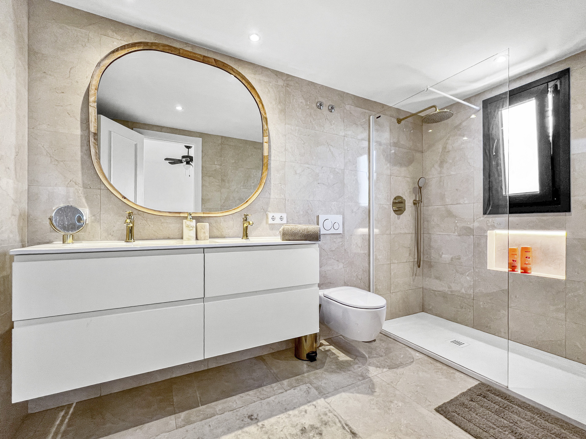 La planta baja se ha transformado por completo para crear un espacio diáfano, luminoso y acogedor que conecta sin interrupciones la cocina, el comedor y el salón. Las grandes puertas de cristal se abren directamente al jardín privado, donde encontrará una zona de comedor cubierta al aire libre, cómodos asientos y una barbacoa. Es el espacio perfecto para disfrutar de comidas a la sombra o de una copa por la noche en el cálido ambiente mediterráneo.