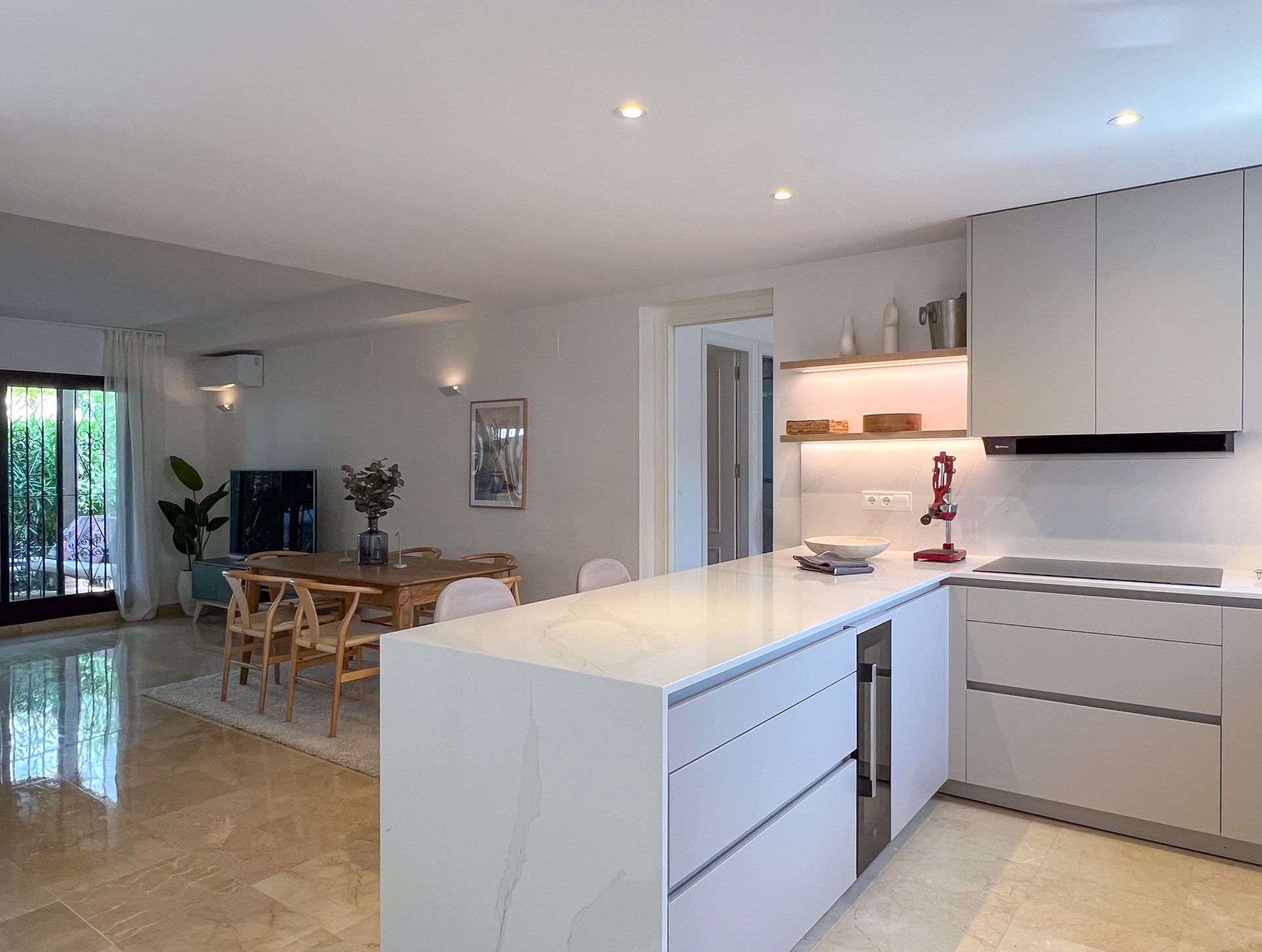 4 soveværelser, 3 badeværelser og et toilet, veludstyret lækkert køkken, en dejlig have og en fantastisk tagterrasse. Gåafstand til strand og promenaden langs stranden, samt til San Pedro by med et hav af hyggelige restauranter, tapas barer osv. Thomver más