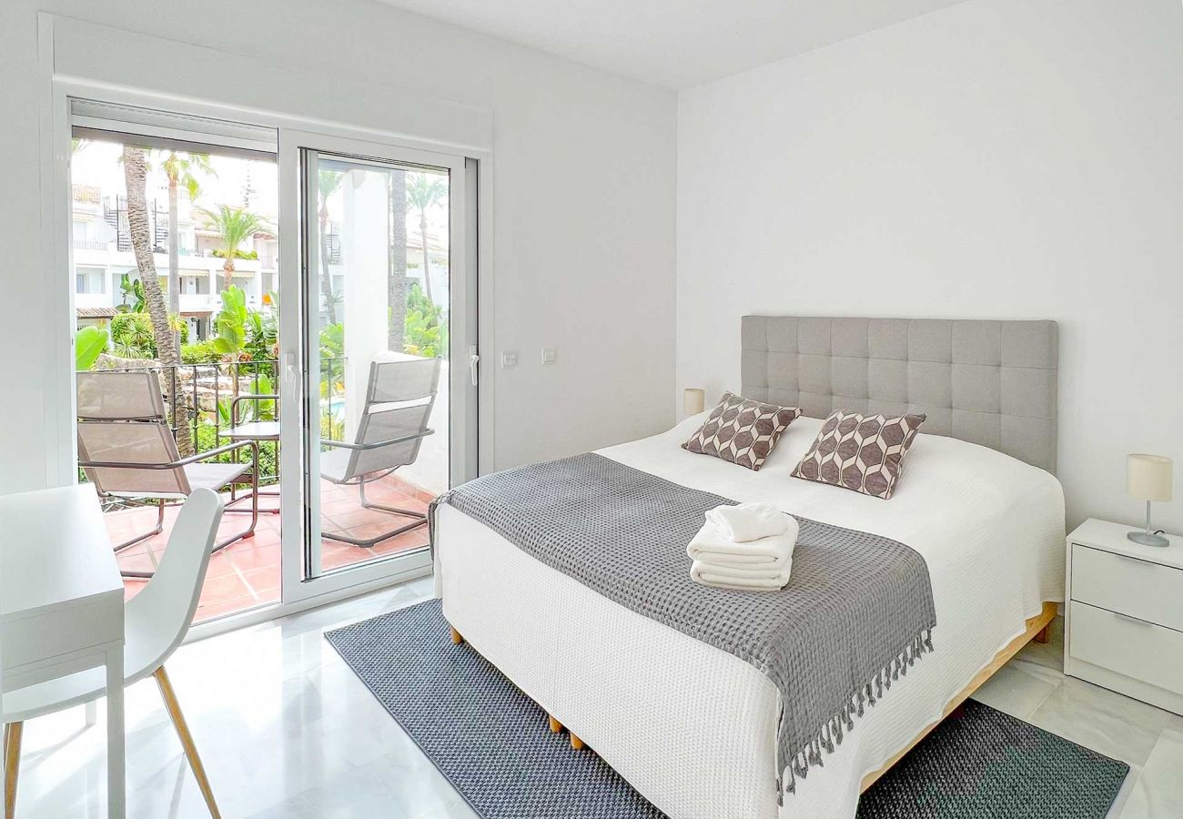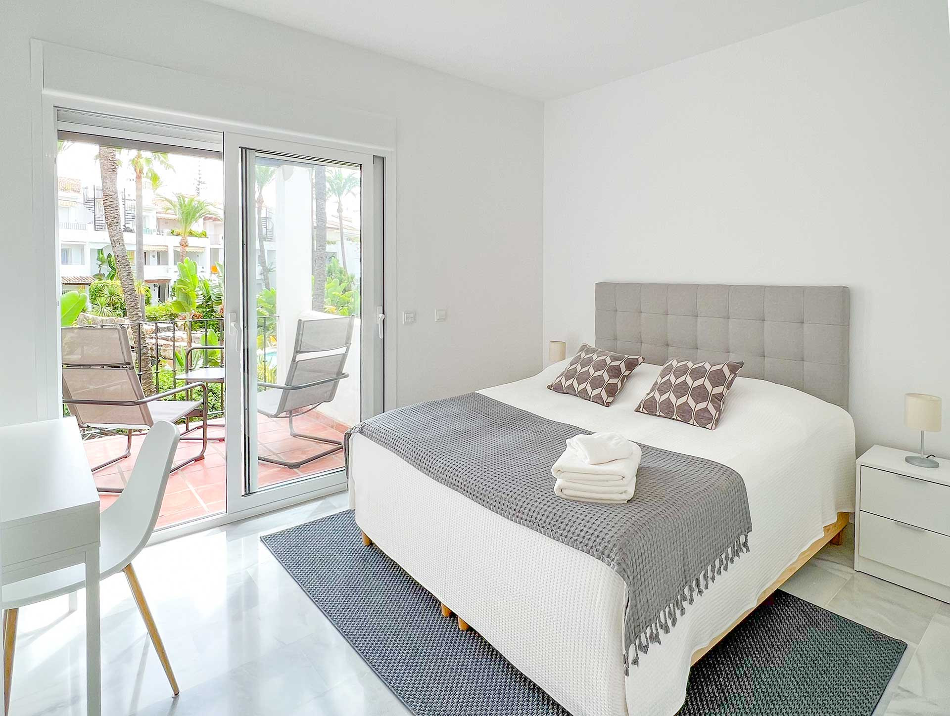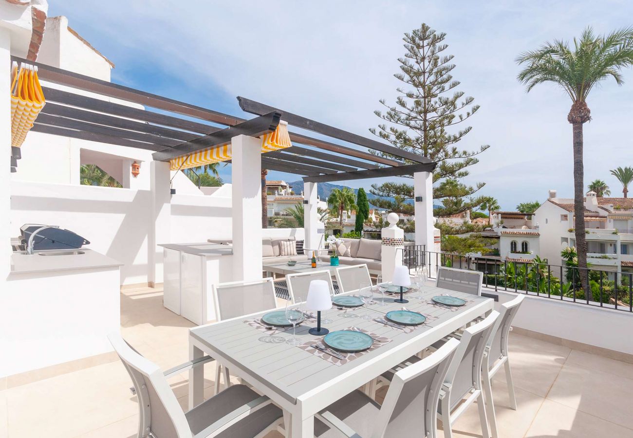 Fantastic accommodation on three floors with an incredible roof terrace overlooking the peaceful courtyard, the pool and beyond the palm trees the sea. The apartment is located in a very quiet area with a few restaurants and close to grocery stores and approx. 3 km walk to Puerto Banus. Thomas was very helpful and quick to respond, both before and after arrival.