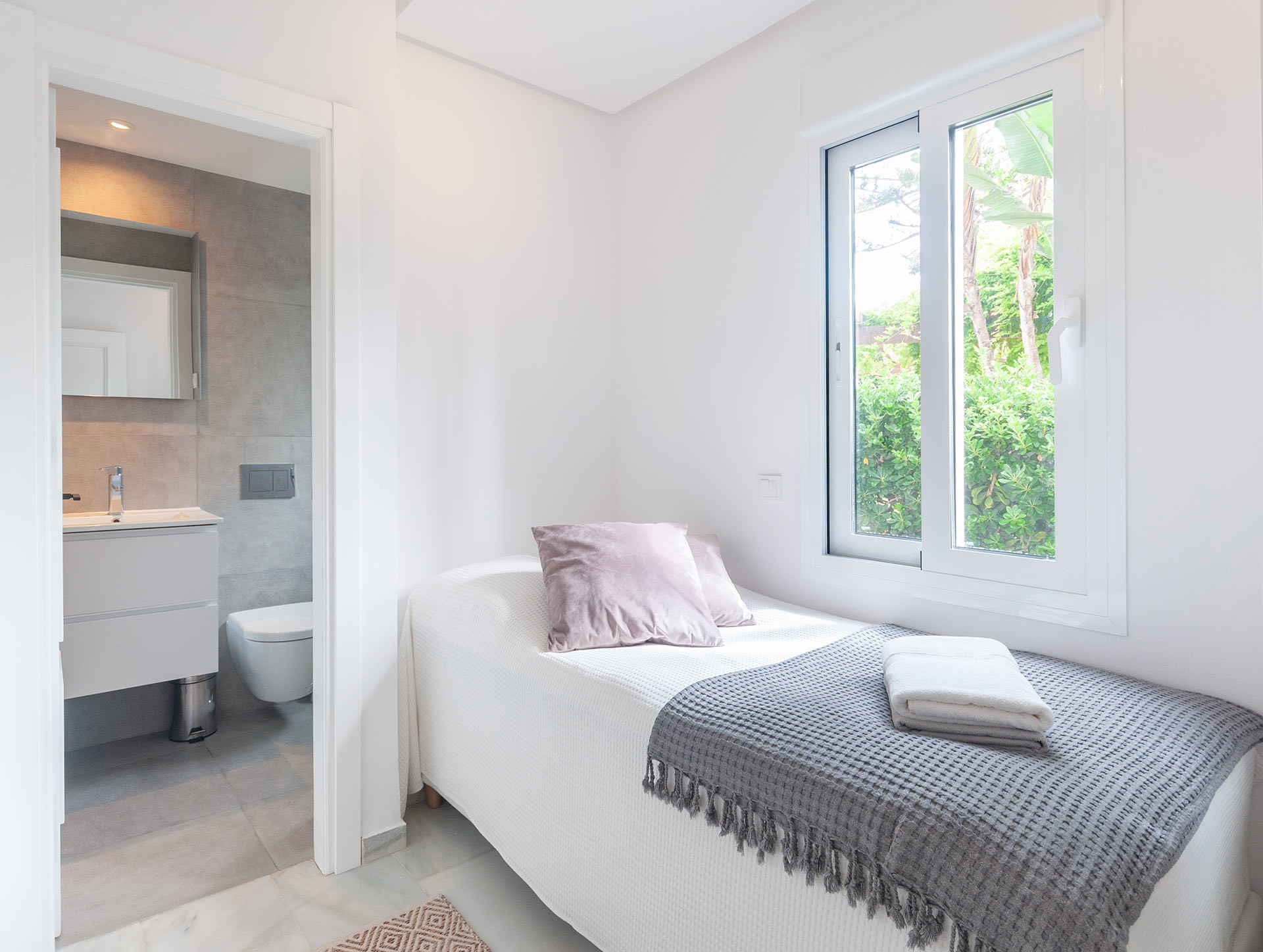 We felt great in this location and the welcome by Coleen was perfect, even though the plane was delayed by 2 hours. It is a very quiet complex of houses, lots of vegetation, shade and singing birds, with direct access to the seafront of San Pedro de Alcantara where you can walk to Puerto Banuseven Marbella. Everything was as described, you have everything you need and everything is modern and functional and the roof terrace is fantastic. There is also a bathroom in the living room. Access by car is extremely fast to any destination, and parking is in front of the house door. In conclusion, I 100% recommend this location.